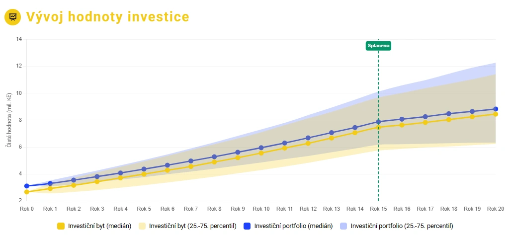 V 50 % simulací (25. až 75. percentil) mělo investiční portfolio konečnou hodnotu 6,3 až 12,3 mil. Kč, zatímco investiční byt stejně často skončil v rozmezí 6,2 mil až 11,4 mil. Kč.