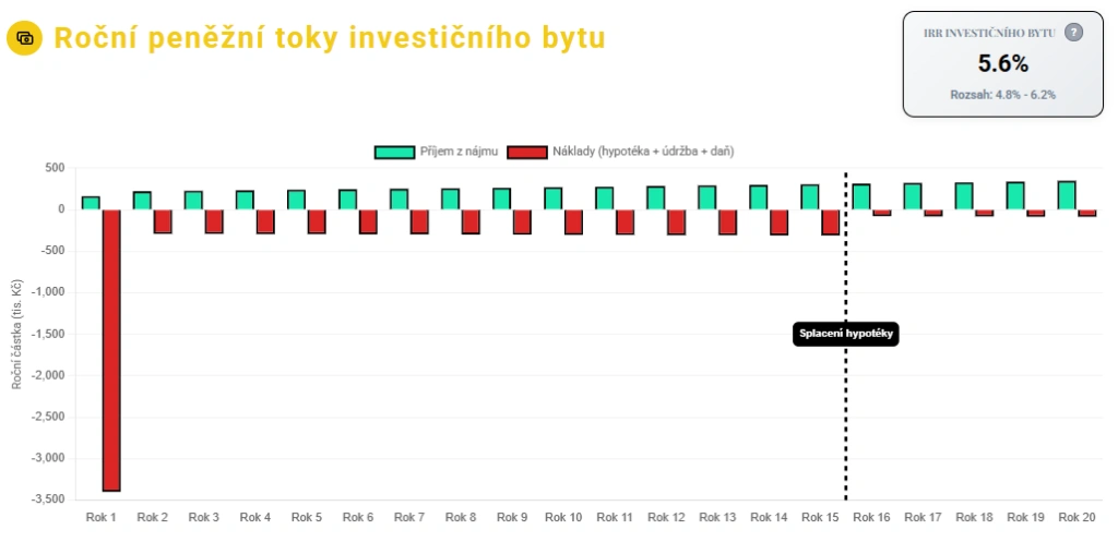 Všimněte si také hodnoty 5,6 % vpravo nahoře. To je tzv. IRR — zjednodušeně řečeno, jde o číslo, které říká: „Kdybyste místo do bytu peníze dávali na spořicí účet, musel by vám nabídnout právě 5,6 % ročně, abyste dopadli stejně.“ IRR totiž bere v potaz celou investici — zálohu, splátky hypotéky, příjmy z nájmu, i konečný prodej bytu — a přepočítá to na jedno srozumitelné procento roční výnosnosti. Ve středních 50 % našich simulací se tato výnosnost pohybovala mezi 4,8 % a 6,2 % za rok.