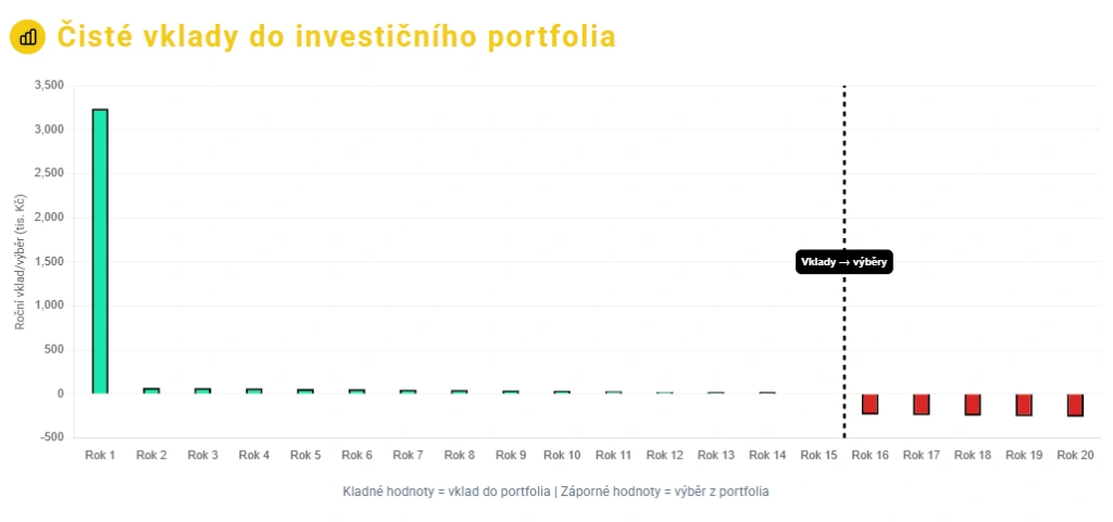 Je tedy vidět, že prvních 15 let se do portfolia peníze přidávají (čím dál tím méně) a posledních pět let se z něj vybírá.