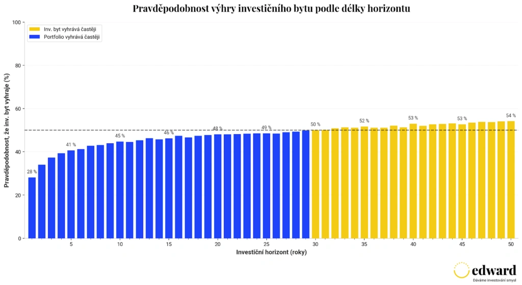Následující graf ukazuje, v kolika procentech simulací vyšla lépe koupě bytu a v kolika investování, podle délky horizontu (až 50 let). Modré sloupce znamenají častější výhru investice, žluté častější výhru koupě bytu.