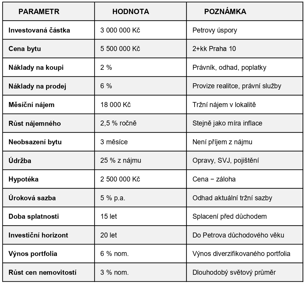 Petr je konzervativní investor. Akciový trh sleduje jen z dálky a nervózně přepíná, když v televizi hlásí něco o poklesu burzy. Líbí se mu myšlenka investičního bytu — něco hmatatelného, co může pronajímat a co „nikdy neklesne na nulu“. A v důchodu z něj bude mít pravidelný příjem z nájmu.